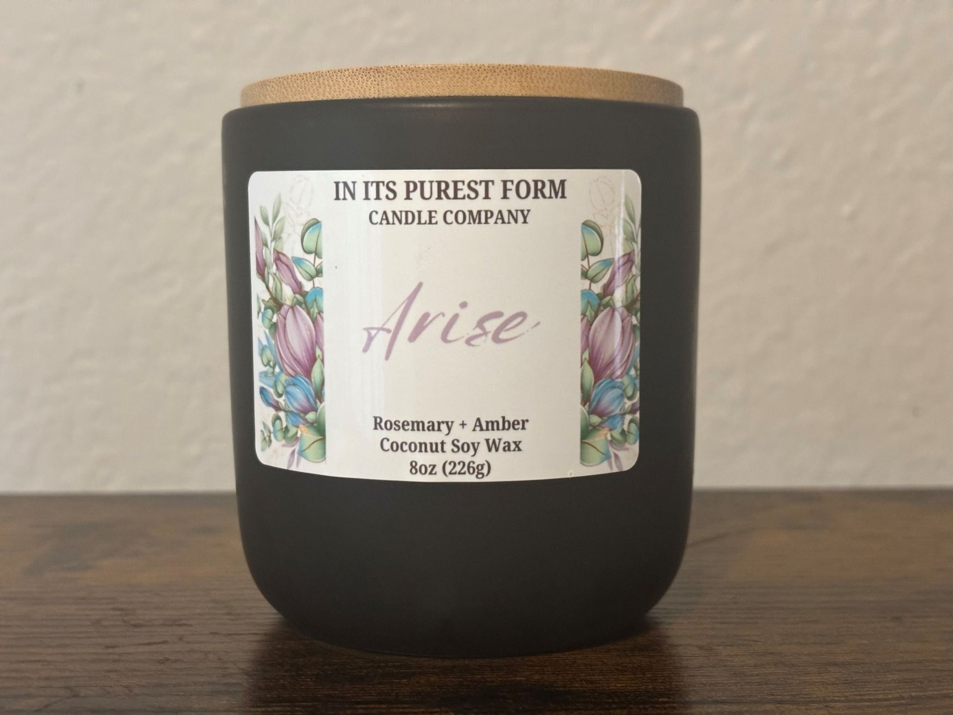 Indulge your senses with ARISE, the 8-oz scented candle made of a luxurious coconut-soy wax blend. Infused with the invigorating scents of rosemary and sage essential oils, and accented with warm amber, this candle will bring a calming and uplifting ambiance to any space.